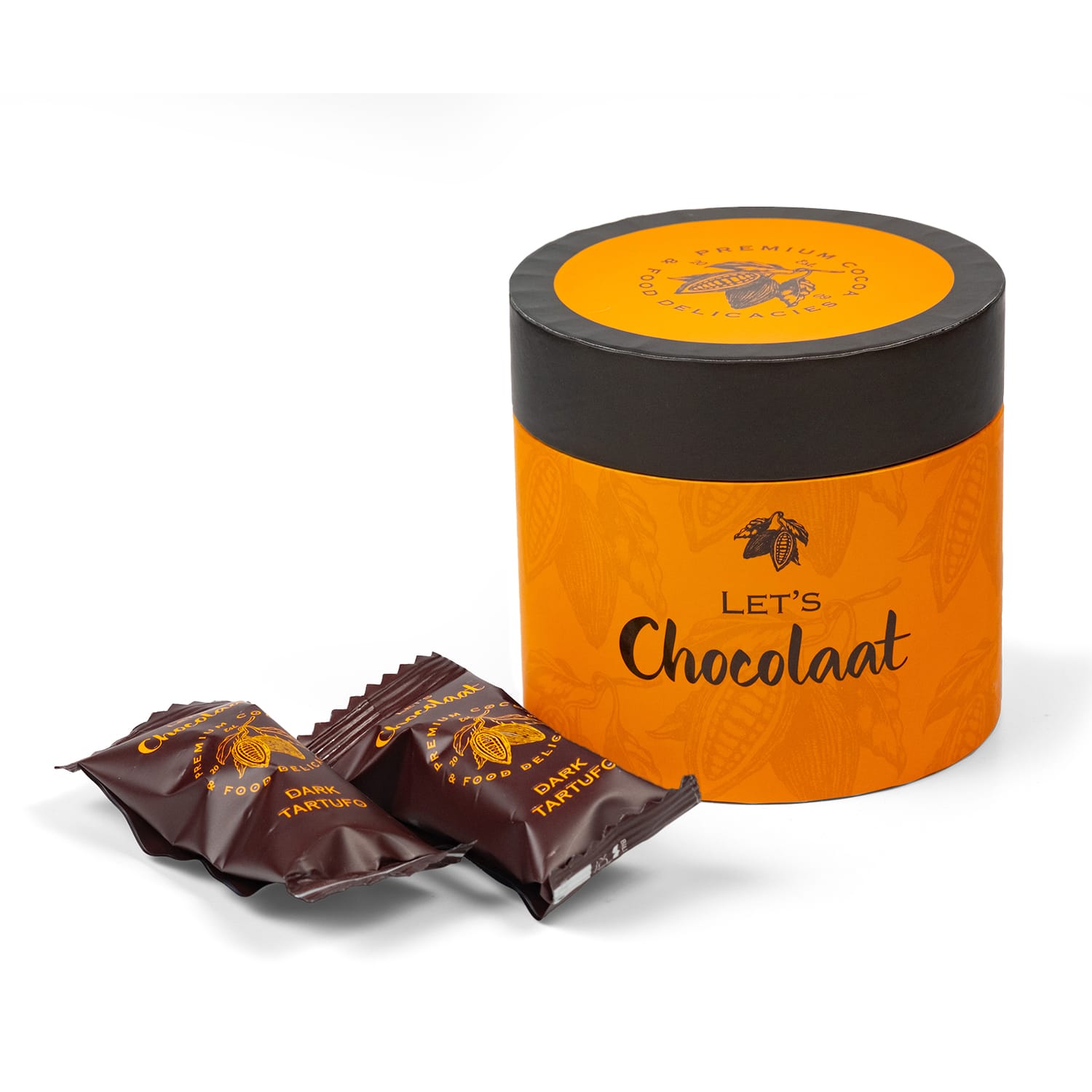 Caja cilíndrica de elegante diseño con 12 unidades de tartufo Dark. Perfectos para regalar.