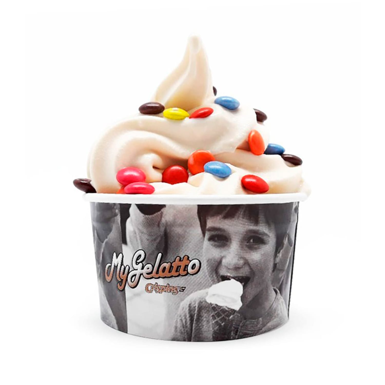 Bote dispensador de topping con grajeas de chocolate de colores. Potencia el sabor y la presentación del helado soft.